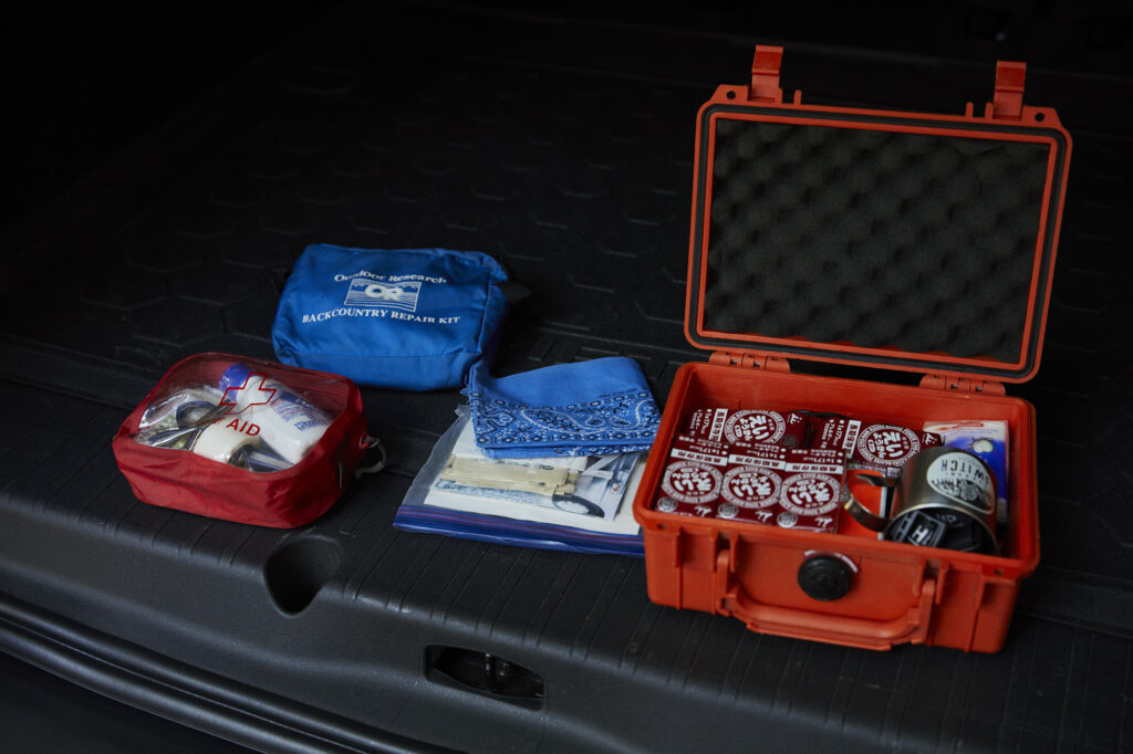 寒川さんが車載している非常用品の一部。救急セットや簡易トイレをはじめ、甘いもの(長期保存できるようかん)や遊べる道具などの“お楽しみ”も含まれています。